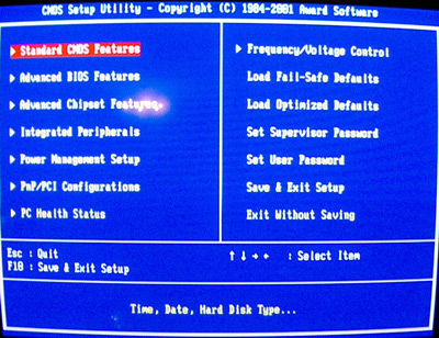 Many of the motherboard currently shipping auto-detect the parts used in your system assembly and do not require the adjustment of the BIOS to work properly. If you feel the need or actually have to adjust the BIOS you need to hit the DEL or F1 or F2 depending on your system and this will take you into the initial BIOS screen. In the example below I show the opening screens for the two most commonly used BIOS. Once again this is where you need to read your manual to understand the performance features that can be achieved by a few quick changes. Be aware a wrong setting can hinder system performance greatly so be careful when making changes.