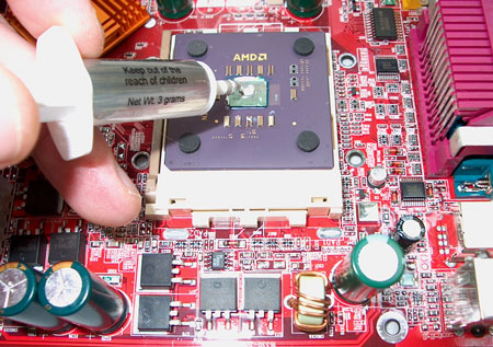 First apply the Thermal compound to the CPU by applying it directly in the center of the CPU die / bit as shown below. A good solid squirt should do the trick.
