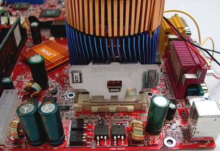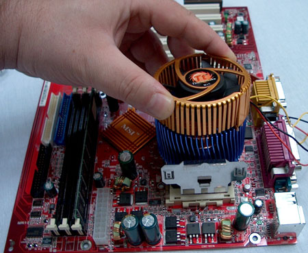 First you must determine the placement of your fan making sure it is covering the CPU properly and then you attach one side to the motherboard by the clips on the cooling solution as shown.