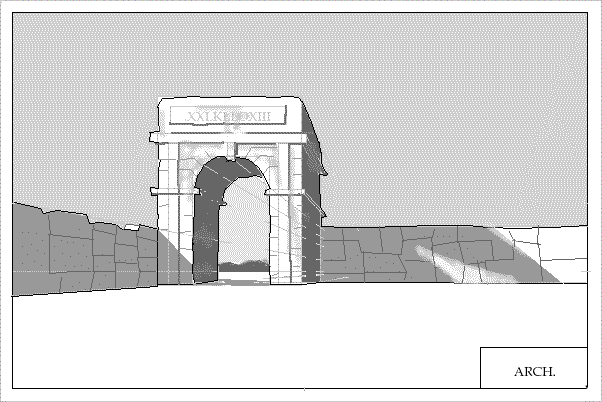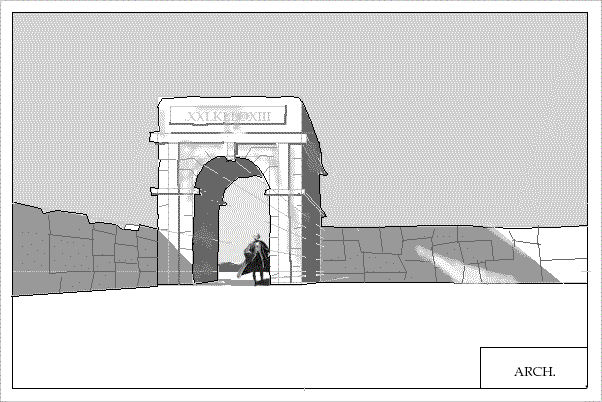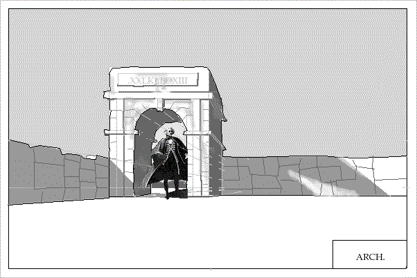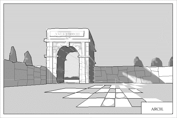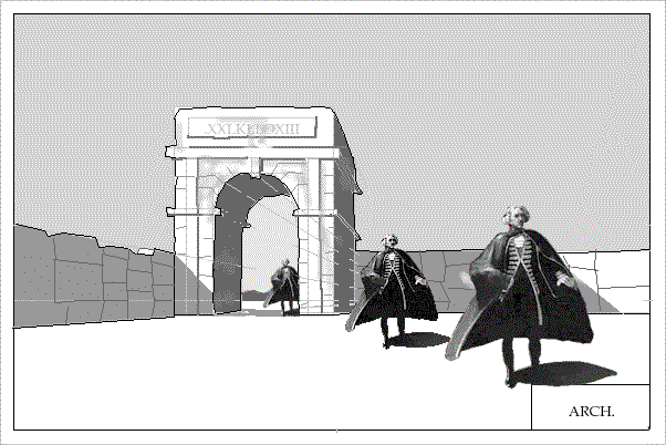 LESSON 10b - TEN b... CONTINUED Aim: To reinforce the notion of 'logical size'. The size of objects being determined by introducing a familiar object at the same 'level' (a similar distance from the viewer). Then to complete the drawing started in the previous lesson. The teacher should print off the following three drawings and hand them out as reference drawings. a) Here I have introduced 'the admiral' and put him in the arch. Suddenly the arch has a particular and definite size. Ask the students, why is that? From the moment a baby opens its eyes it begins keying-in shapes, with one of the first being the human face and body. Then it learns to recognise various other shapes in order of their importance. The child also learns to judge how far or how close is a particular object. Ask the class how this is done? You could mention that these common perceptions are what bind people together. There are, of course philosophical implications here concernig the commonality of experience ... but that is what drawing is all about! Anyway, in the order of things human the body is a far more dominant form than any old archway. This body of our 'Admiral Cowdisley Shovel' determines the size of the arch (how high is it here?) as we all know the avereage height of the human body, but, what if we shrink the poor old sailor? b) Suddenly the arch has grown. How tall is it now? c) OK so now I have multiplied the figures