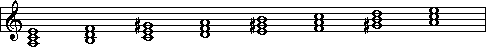 We can use Roman Numerals to describe all of these triads. We did this in Lesson 15 when dealing with tonic and dominant chords. For example, in the triads shown above, the note 'C' is the first note of the C-major scale. Therefore, we assign the number '1' to that chord. When describing chords using numbers, it is traditional to use Roman Numerals. It is also traditional to use upper-case letters for major and augmented chords, and lower-case letters for minor and diminished chords. Here are the triads of a C-major scale, properly numbered: