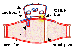 The bridge The bridge transfers some of the energy of vibration of the string to the body of the violin. The bridge itself is very effective at transmitting power to the body at frequencies from about one to four kHz, which is where the ear is most sensitive. This is one of the reasons for the bright timbre of the violin.You can reduce the effectiveness of the bridge at transmitting power by attaching a mass to it - the mass is usually called a mute, and it serves to make the instrument both quieter and less bright in timbre. The bridge stands on the belly between the f holes. These holes have two different functions. One is to connect the air inside to the air outside, and we talk about this below. The other is a result of their length: the part of the belly lying between the f holes can move more easily than can most of the wood of the body. Let's see how this works.
